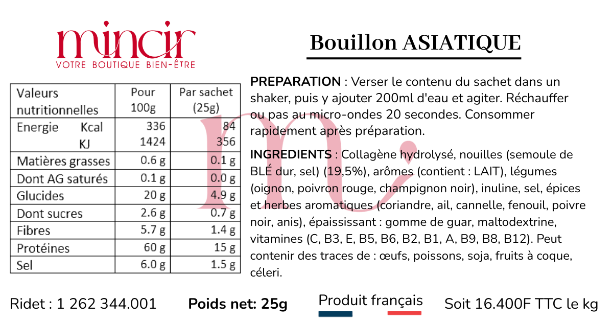Préparation : Verser le contenu du sachet dans un shaker, puis y ajouter 200ml d’eau et agiter. Réchauffer ou pas au micro-ondes 20 secondes. Consommer rapidement après préparation.
