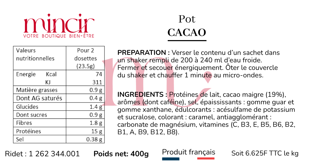 Préparation : Verser le contenu d’un sachet dans un shaker rempli de 200 à 240 ml d’eau froide. Fermer et secouer énergiquement. Ôter le couvercle du shaker et chauffer 1 minute au micro-ondes.