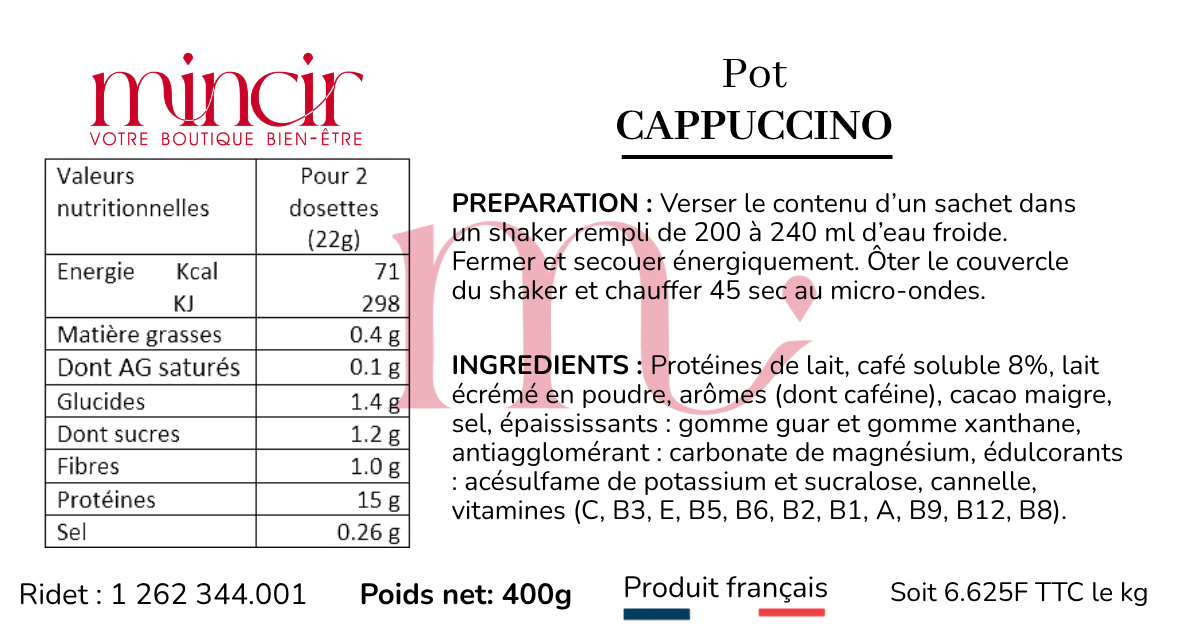 Préparation : Verser le contenu d’un sachet dans un shaker rempli de 200 à 240 ml d’eau froide. Fermer et secouer énergiquement. Ôter le couvercle du shaker et chauffer 45 sec au micro-ondes.