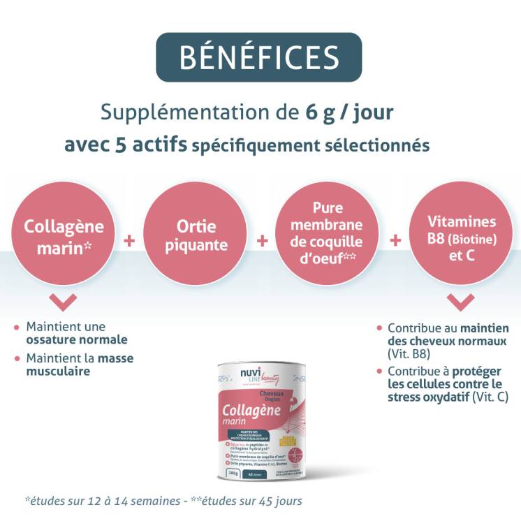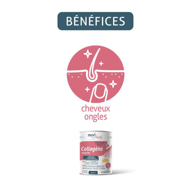 Collagène marin avec ortie piquante, membrane de coquille d’oeuf, vitamines B8 (biotine) et C BIO pour une action réparatrice et reminéralisante cheveux & ongles.