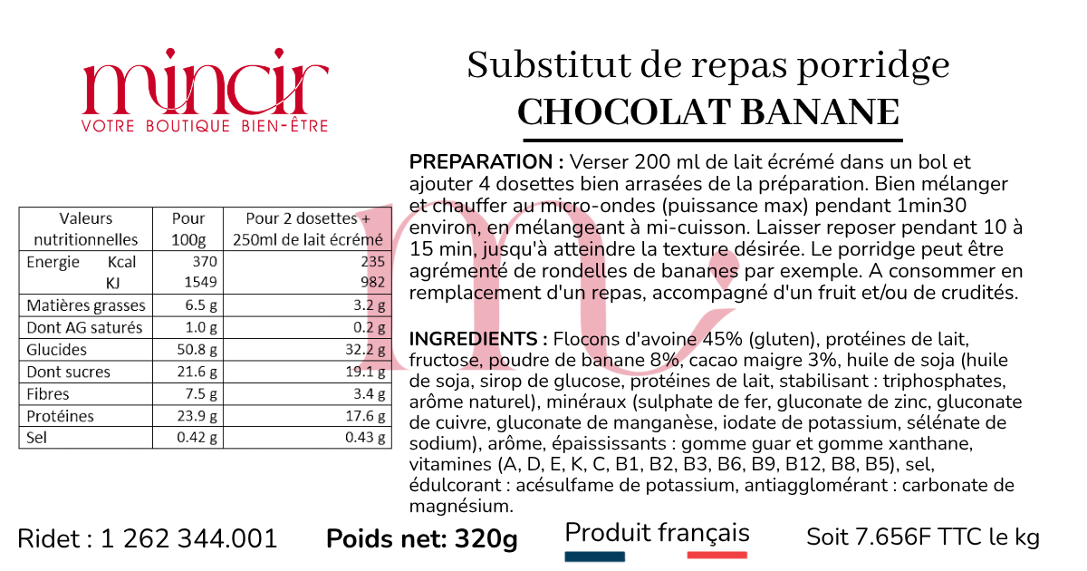 Préparation : Verser 200 ml de lait écrémé dans un bol et ajouter 4 dosettes bien arrasées de la préparation. Bien mélanger et chauffer au micro-ondes (puissance max) pendant 1min30 environ, en mélangeant à mi-cuisson. Laisser reposer pendant 10 à 15 min, jusqu’à atteindre la texture désirée. Le porridge peut être agrémenté de rondelles de bananes par exemple. A consommer en remplacement d’un repas, accompagné d’un fruit et/ou de crudités.