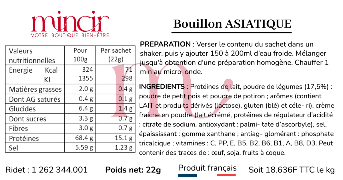 Préparation : Verser le contenu du sachet dans un shaker, puis y ajouter 150 à 200ml d’eau froide. Mélanger jusqu’à obtention d’une préparation homogène. Chauffer 1 min au micro-onde.