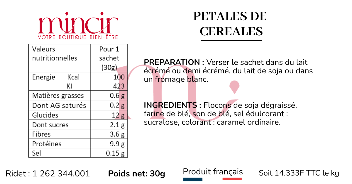 Préparation : Verser le sachet dans du lait écrémé ou demi écrémé, du lait de soja ou dans un fromage blanc.