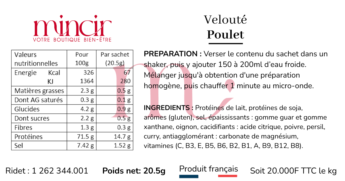 Un délicieux velouté de poulet hyperprotéiné, à la texture onctueuse et au goût réconfortant. Riche en protéines, il s’intègre parfaitement à votre régime hyperprotéiné. Ce velouté savoureux est prêt en quelques instants, simplement en ajoutant de l’eau ! Faites le plein de protéines et de plaisir, sans graisses ni sucres superflus, pour un repas léger et équilibré.